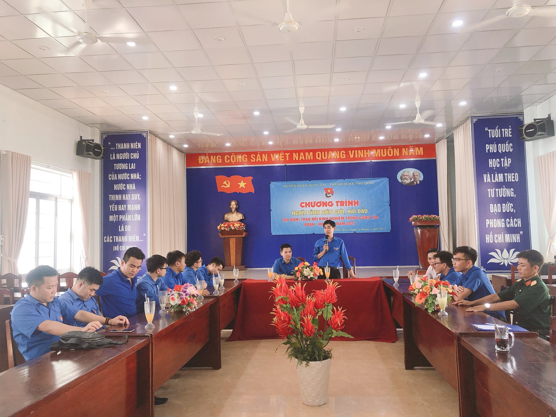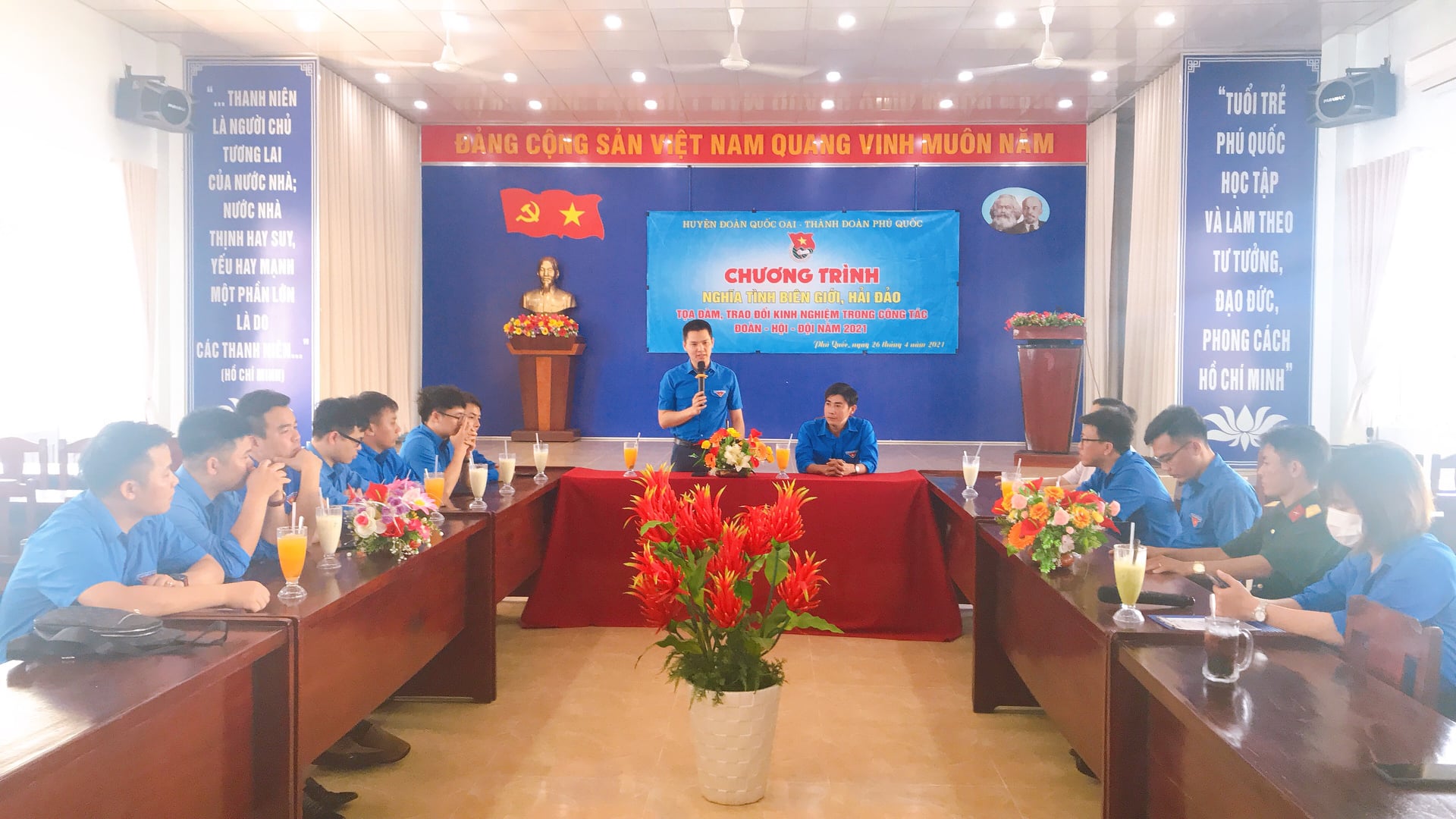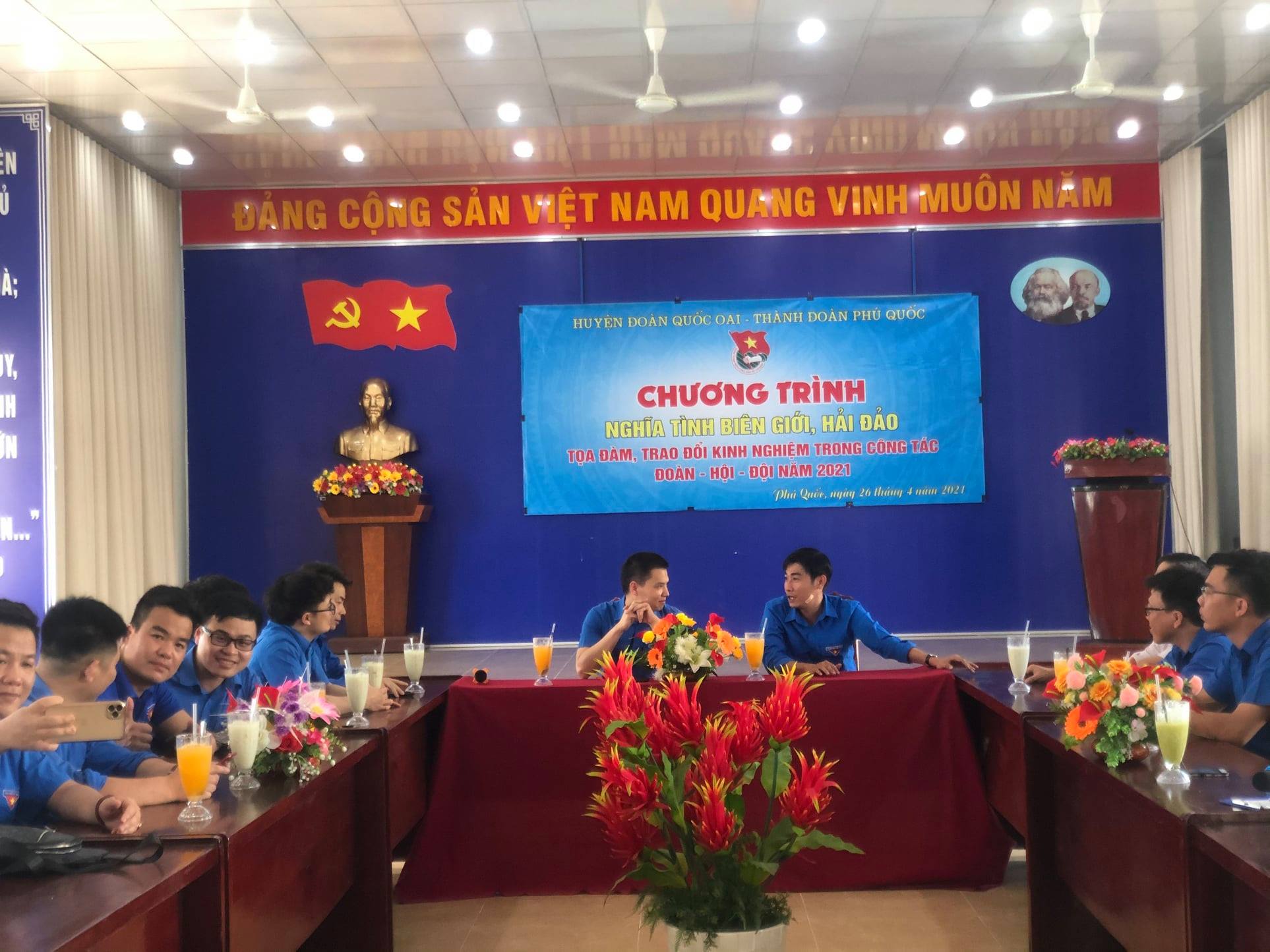 Thiết thực kỷ niệm 46 năm ngày Giải phóng miền Nam thống nhất đất nước (30/4/1975 – 30/4/2021) và Ngày Quốc tế thiếu nhi (1/5/2021), vào chiều ngày 26/4/2021, Thành Đoàn Phú Quốc và Huyện Đoàn Quốc Oai (Thành Đoàn Hà Nội) tổ chức Chương trình Nghĩa tình Biên giới Hải đảo, trao đổi kinh nghiệm trong công tác Đoàn – Hội – Đội năm 2021. Dự chương trình có đồng chí Nguyễn Lê Huy – Thành ủy viên, Bí thư Thành Đoàn Phú Quốc, đồng chí Nguyễn Văn Đồng – Huyện ủy viên, Bí thư Huyện Đoàn Quốc Oai, các đồng chí là UV.BTV của hai đơn vị.