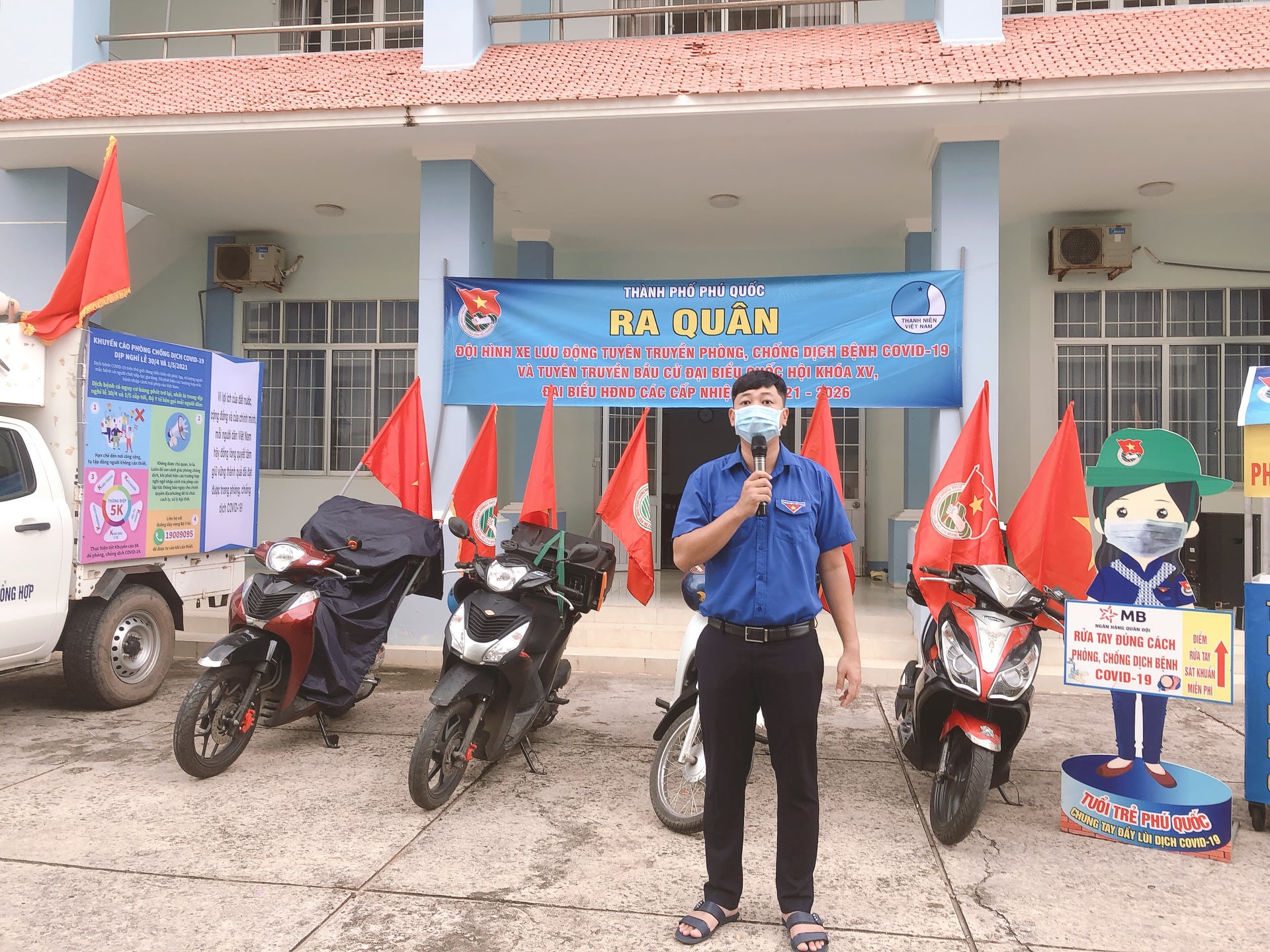 Sáng ngày 29/4/2021 Thành Đoàn Phú Quốc Ra quân đội hình xe lưu động tuyên truyền phòng, chống dịch bệnh covid-19 và tuyên truyền bầu cử đại biểu Quốc hội khóa xv, đại biểu HĐND các cấp nhiệm kỳ 2021 – 2026. Đồng thời tổ chức các điểm phát khẩu trang miễn phí cho người dân.