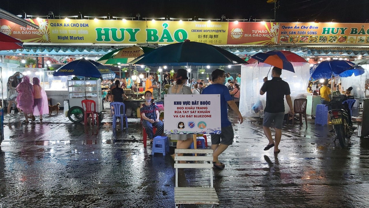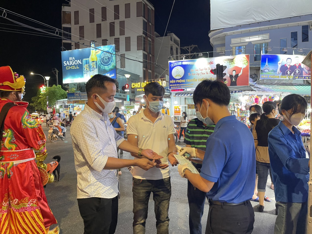 Anh Nguyễn Quốc Long (29 tuổi), du khách từ Hà Nội, vừa bước xuống xe ô tô, chuẩn bị vào tham quan chợ đêm Phú Quốc thì vô tình làm rơi khẩu trang xuống nền đất ướt vì mưa. Trong lúc Long loay hoay chưa biết lấy đâu ra khẩu trang thế thì anh nhìn thấy tấm bảng của BQL chợ đêm yêu cầu du khách phải đeo khẩu trang khi vào chợ. Ngay lúc đó, một bạn đoàn viên bước đến, trao cho Long một chiếc khẩu trang khác.
