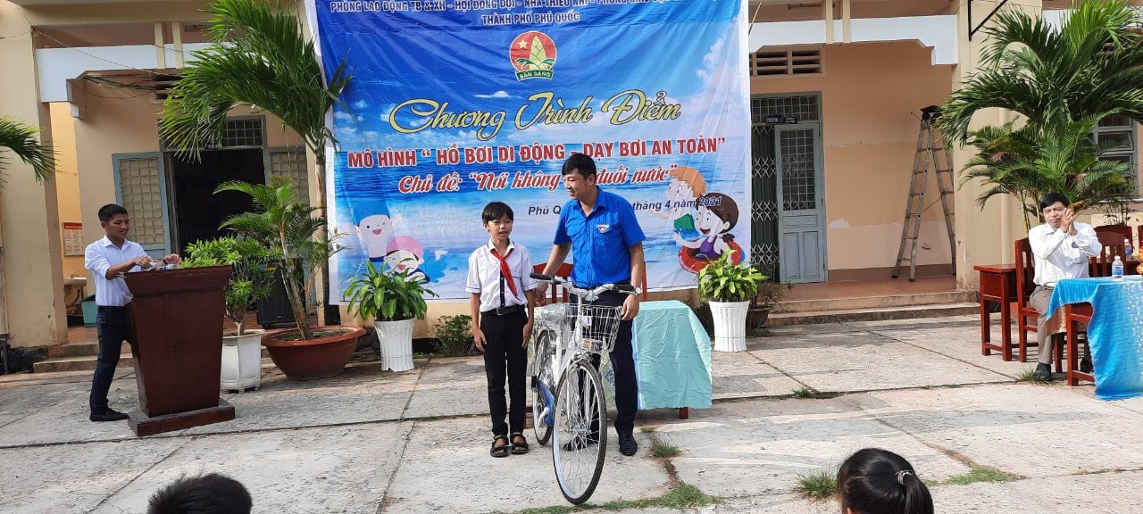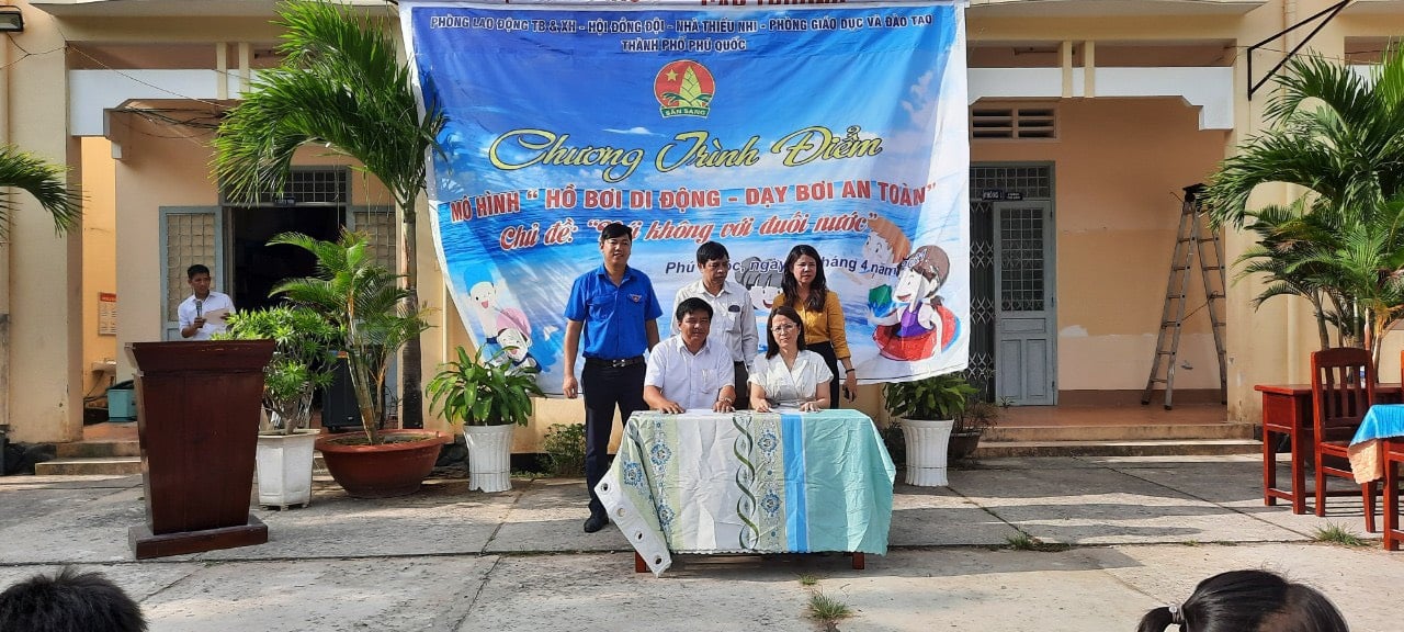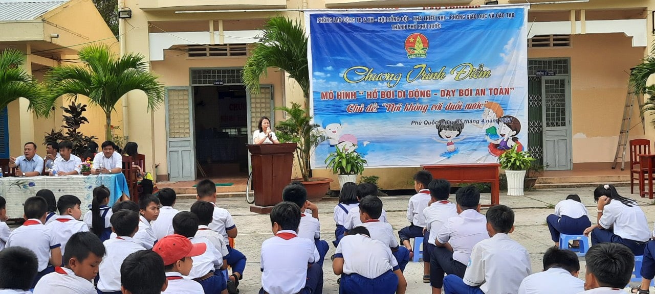 Sáng ngày 05/4/2021 Hội Đồng Đội thành phố đã phối hợp với Nhà Thiếu nhi, Phòng Lao động Thương binh & Xã hội và Phòng Giáo dục và Đào tạo thành phố Phú Quốc ra mắt Mô hình “Bể bơi di động – Dạy bơi an toàn” tại trường TH – THCS Bãi Thơm.